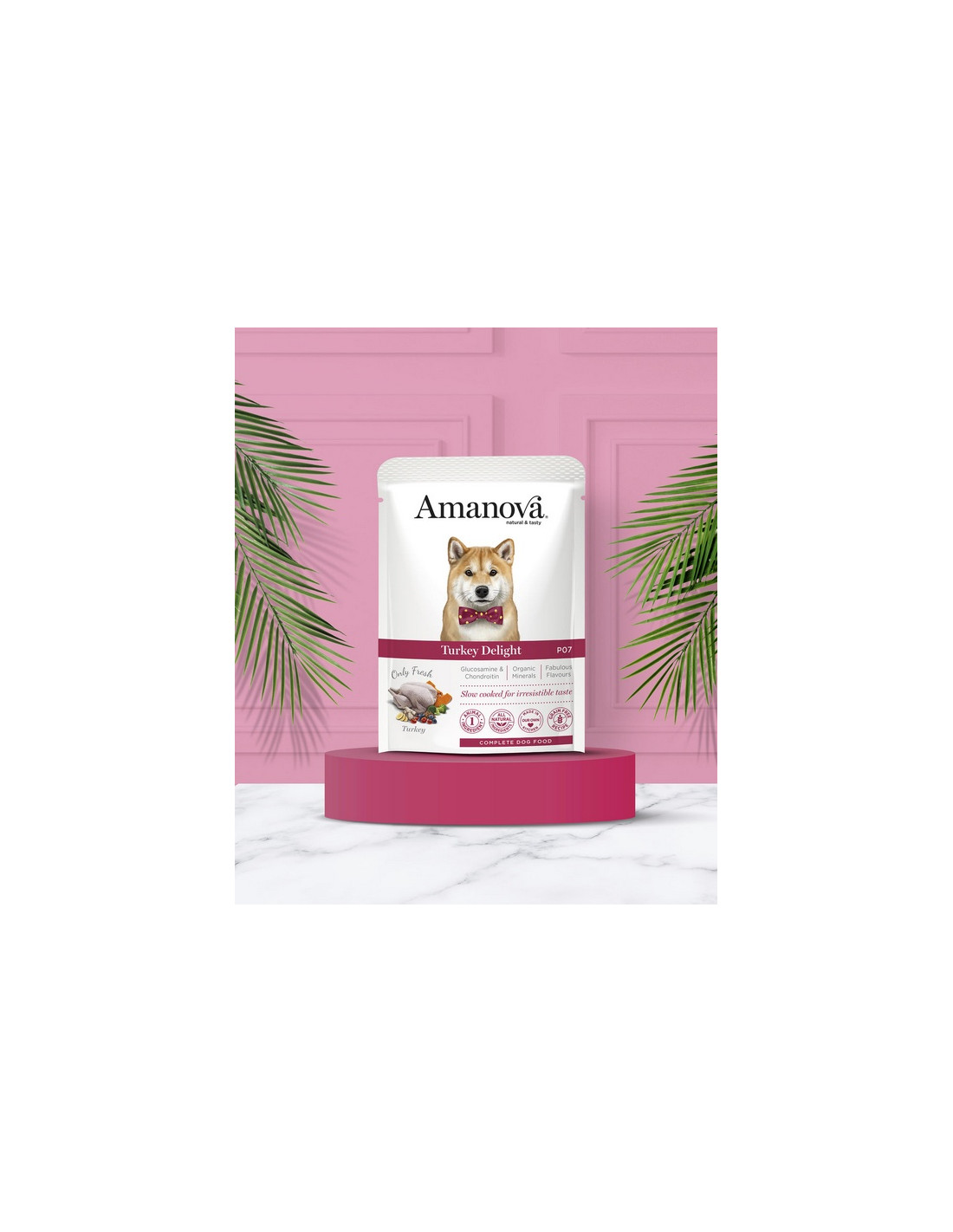 Amanova Adult Turkey Delight to najwyższej jakości wilgotna karma dla dorosłych psów, stworzona z myślą o ich zdrowiu i dobrym samopoczuciu. Opiera się na 64% świeżego indyka, który dostarcza pełnowartościowego białka i niezbędnych aminokwasów, wspierając mocne mięśnie i optymalną kondycję.