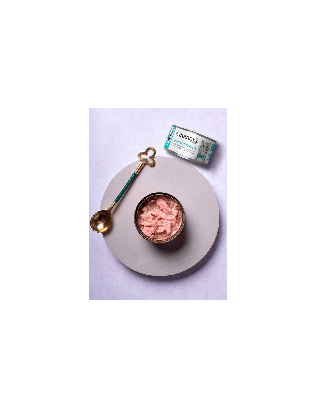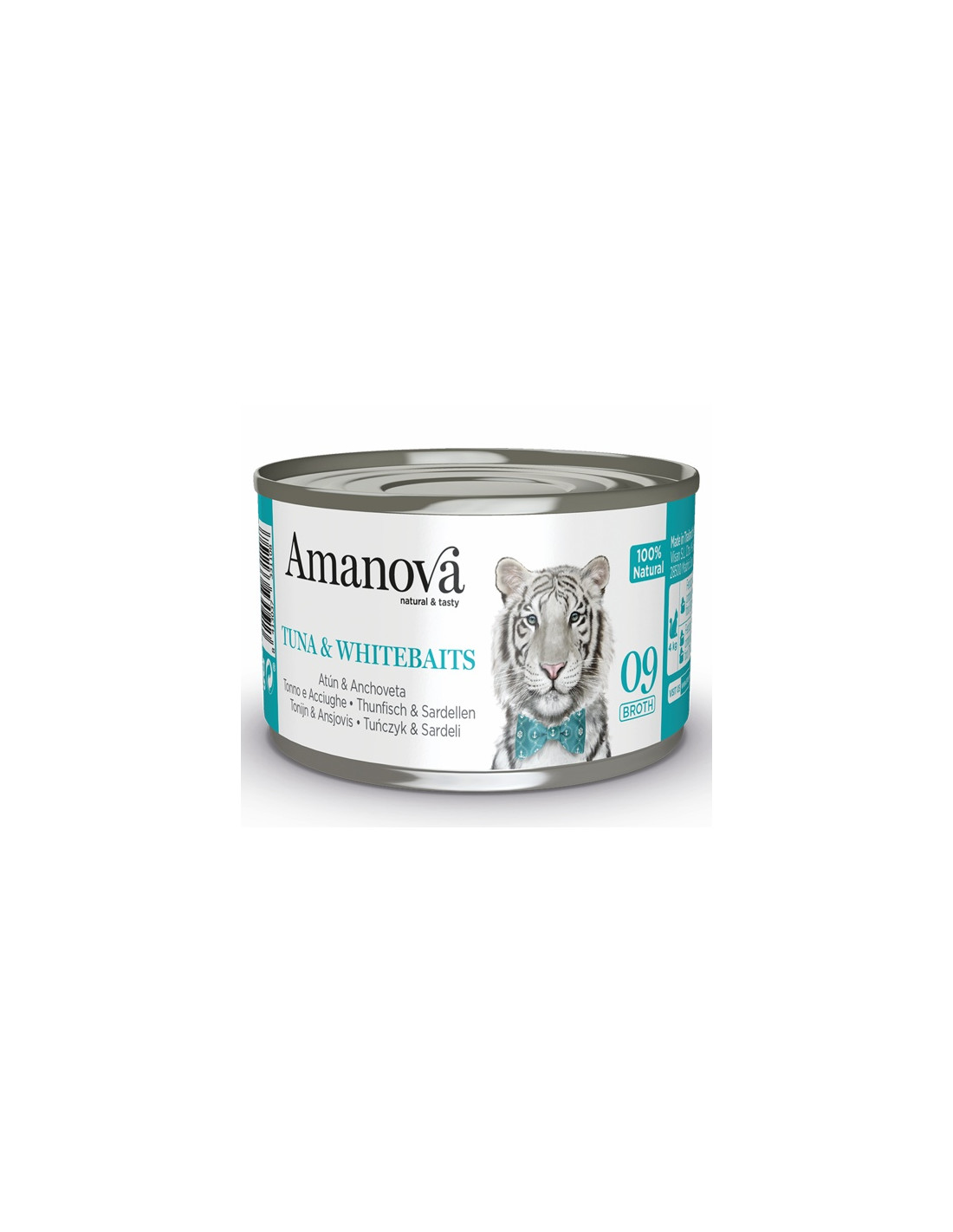 Amanova Cat Tuna & Whitebaits - tuńczyk i białoryby w bulionie to wysokiej jakości naturalna mokra karma uzupełniająca dla kota, stworzona na bazie 60% świeżego tuńczyka, z dodatkiem białorybów i wody. Idealnie sprawdzi się jako zdrowe uzupełnienie codziennej diety Twojego kota – bez zbóż, sztucznych dodatków, barwników i konserwantów.