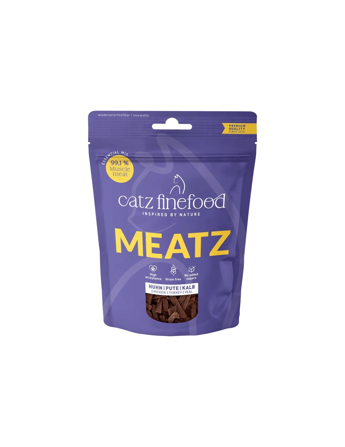Catz Finefood Meatz Essential Mix to chrupiące paski z 100% grillowanego i suszonego mięsa z trzech gatunków: kurczaka, indyka i cielęciny.