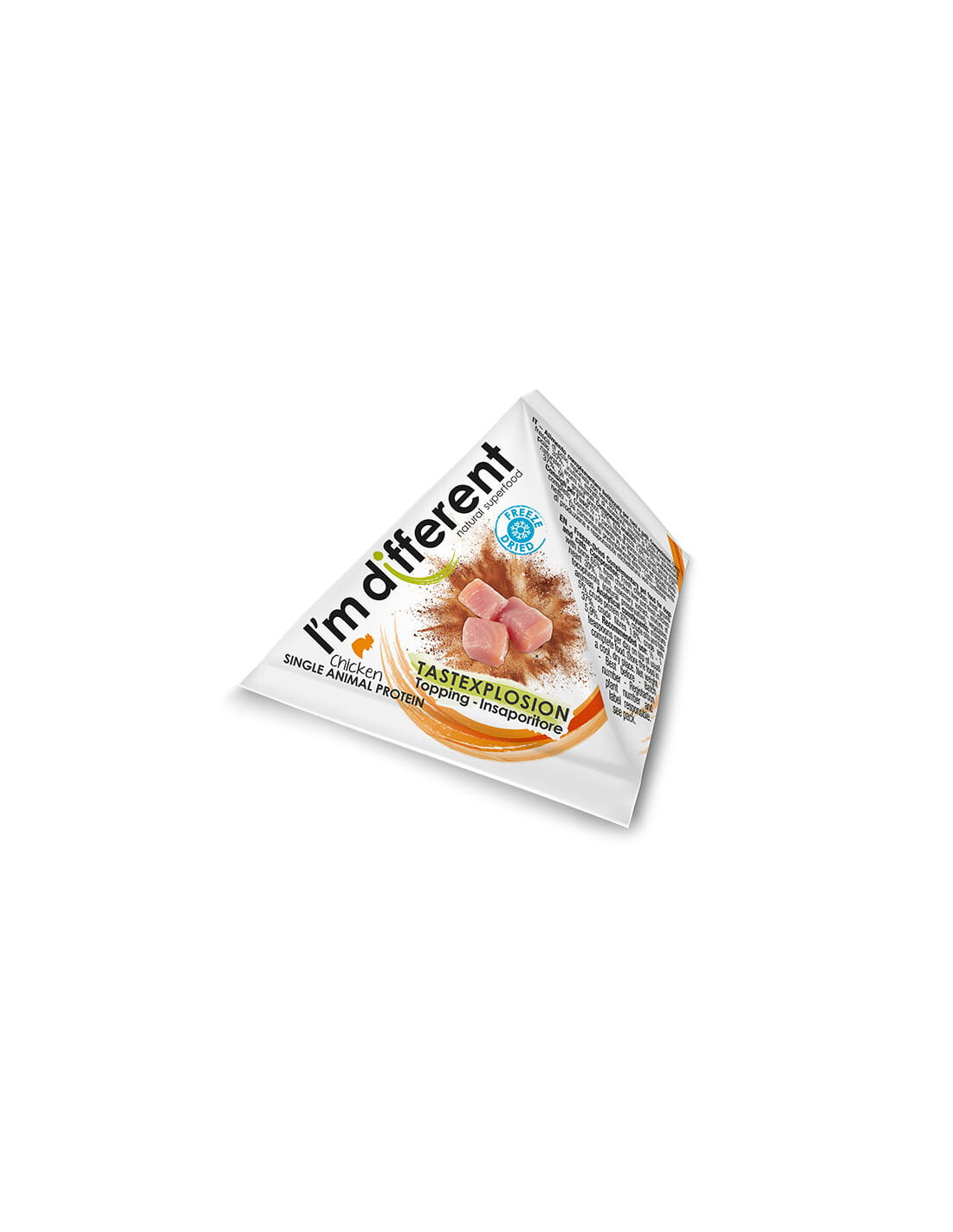 I’m different eksplozja smaku! Liofilizowana posypka (topper) z kurczaka z jednego białka zwierzęcego dla psów i kotów. Wyprodukowano we Włoszech z ponad 95% surowego i świeżego kurczaka, jakości human grade.
