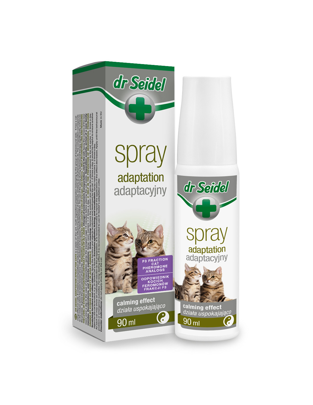 Spray adaptacyjny dla kotów to nowoczesny, wieloskładnikowy preparat z serii pomocy behawioralnych. Działa na koty uspokajająco i łagodząco. Zawiera kompozycję naturalnych substancji oddziaływujących na zachowanie zwierząt podobnie jak kocie feromony. Kompozycja ta odpowiada znanej już od 1996 roku mieszaninie ujawnionej w patencie europejskim EP0724832. Zastosowanie sprayu w trakcie terapii behawioralnej znacznie wspomaga jej proces. Zapewnia kotu poczucie bezpieczeństwa.