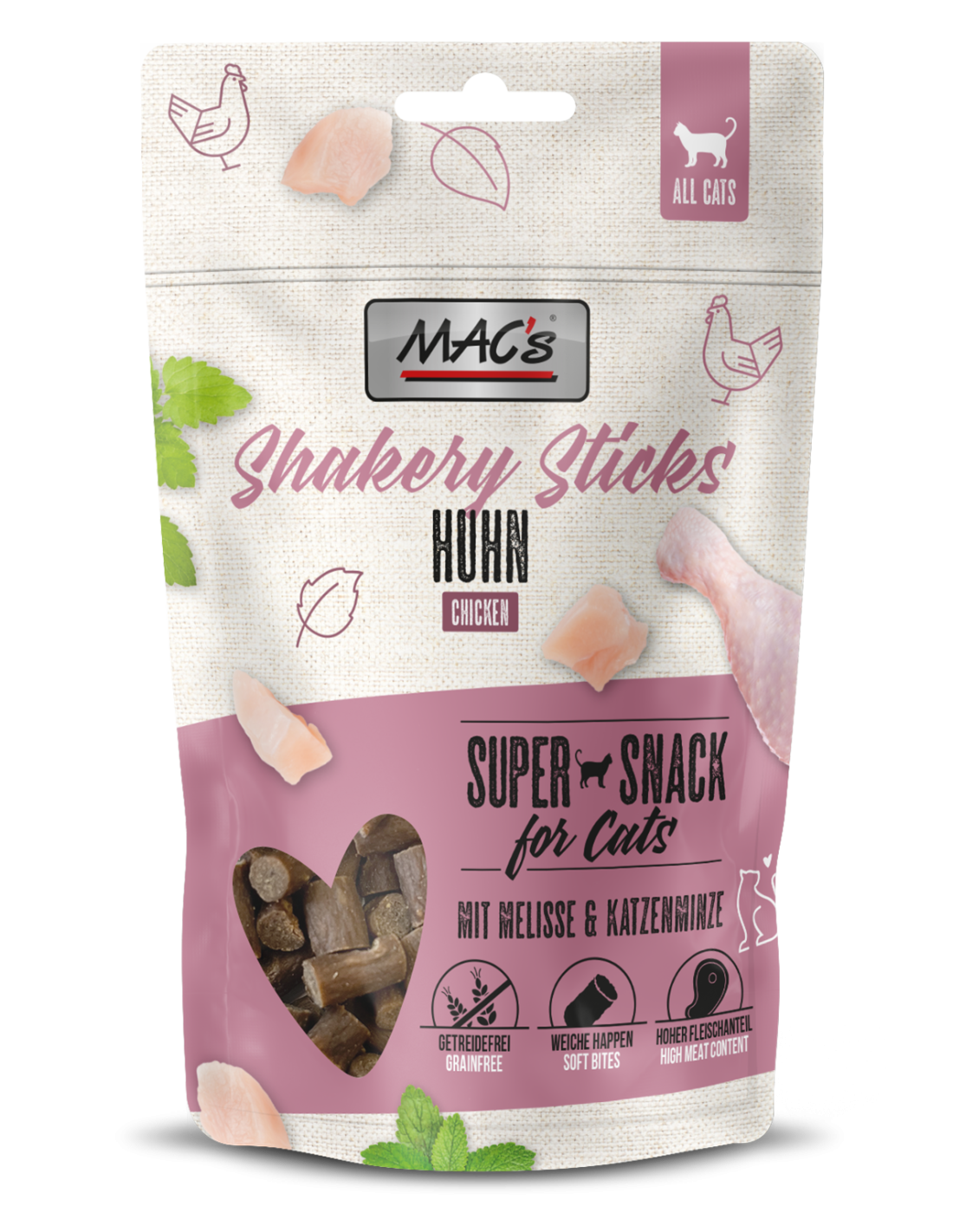 Shakery Chicken Sticks firmy MAC to idealne rozwiązanie dla kocich przyjaciół, którzy uwielbiają drób! Pełne świeżego mięsa, te bezzbożowe pałeczki idealnie nadają się jako nagroda, jako urozmaicenie diety lub jako smaczna przekąska. Dobroczynne superfoods, melisa lekarska i kocimiętka, wspomagają trawienie i działają uspokajająco, pomagając Twojemu futrzanemu przyjacielowi radzić sobie z codziennymi wyzwaniami i stresującymi sytuacjami. To naprawdę super przekąska dla Twojego kociego towarzysza!