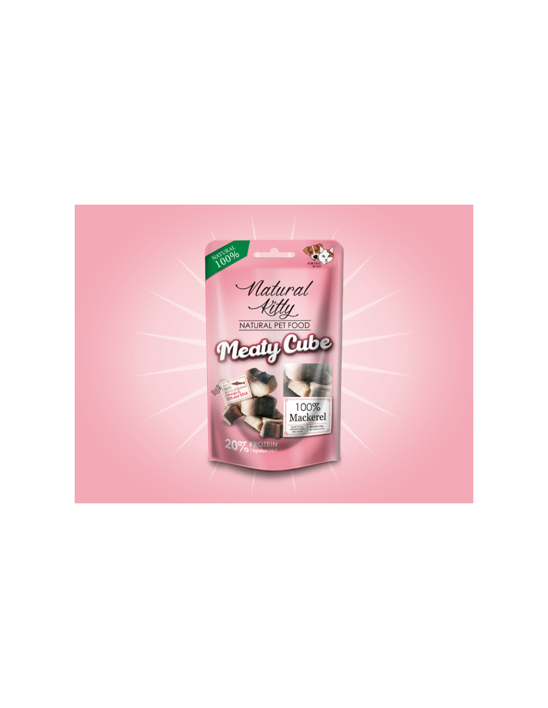 Natural KittyNatural Kitty Przysmak Meaty Cube Mackerel to naturalny przysmak dla kotów i psów z makreli. Jest to produkt bogaty w białko, z minimalną zawartością tłuszczu. Nie zawiera ani sztucznych dodatków ani glutenu. Przysmak świetnie sprawdza się jako nagroda lub urozmaicenie diety.