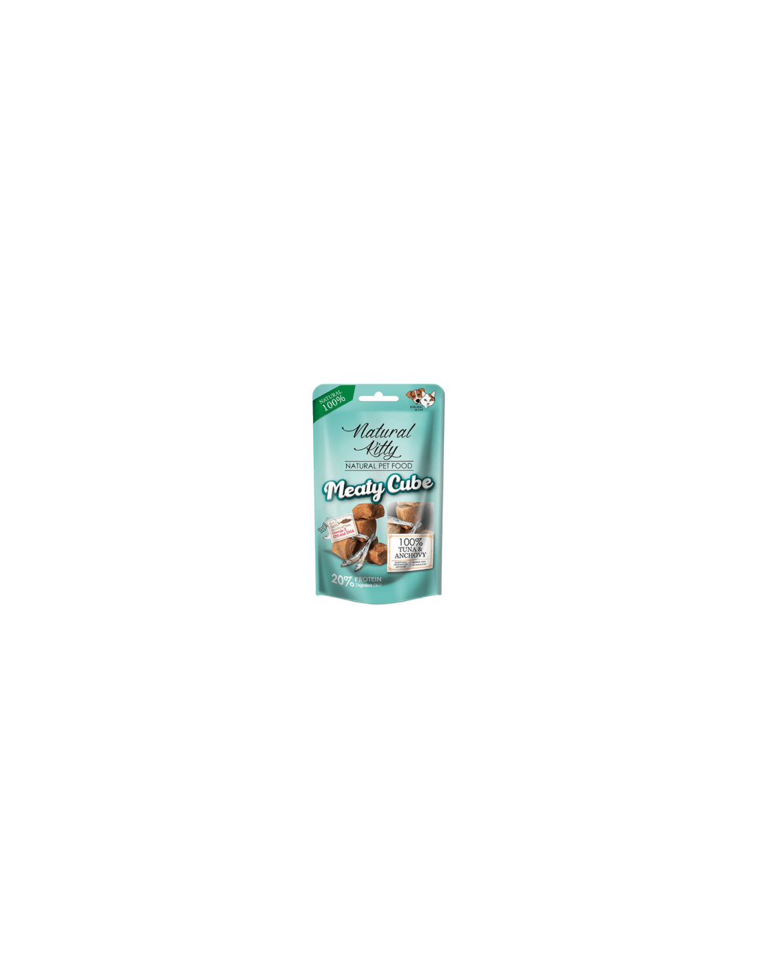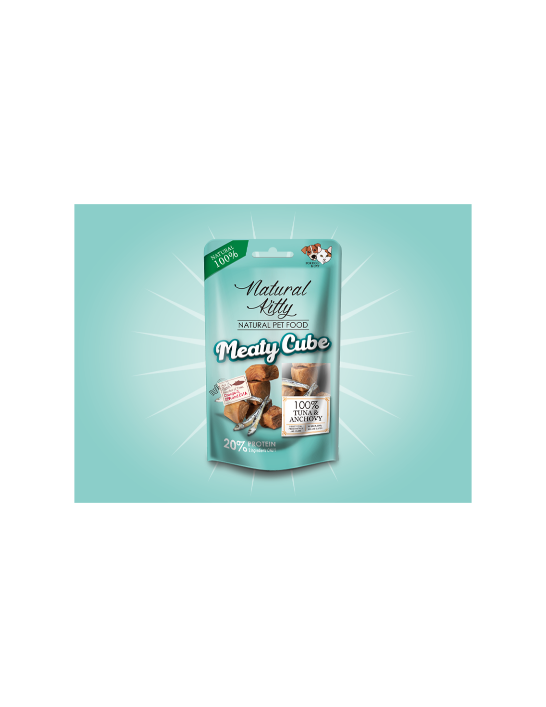 Natural KittyNatural Kitty Przysmak Meaty Cube Tuna & Anchovy to naturalny przysmak dla kotów i psów z tuńczyka i anchois. Jest to produkt bogaty w białko, z minimalną zawartością tłuszczu. Nie zawiera ani sztucznych dodatków ani glutenu. Przysmak świetnie sprawdza się jako nagroda lub urozmaicenie diety.
