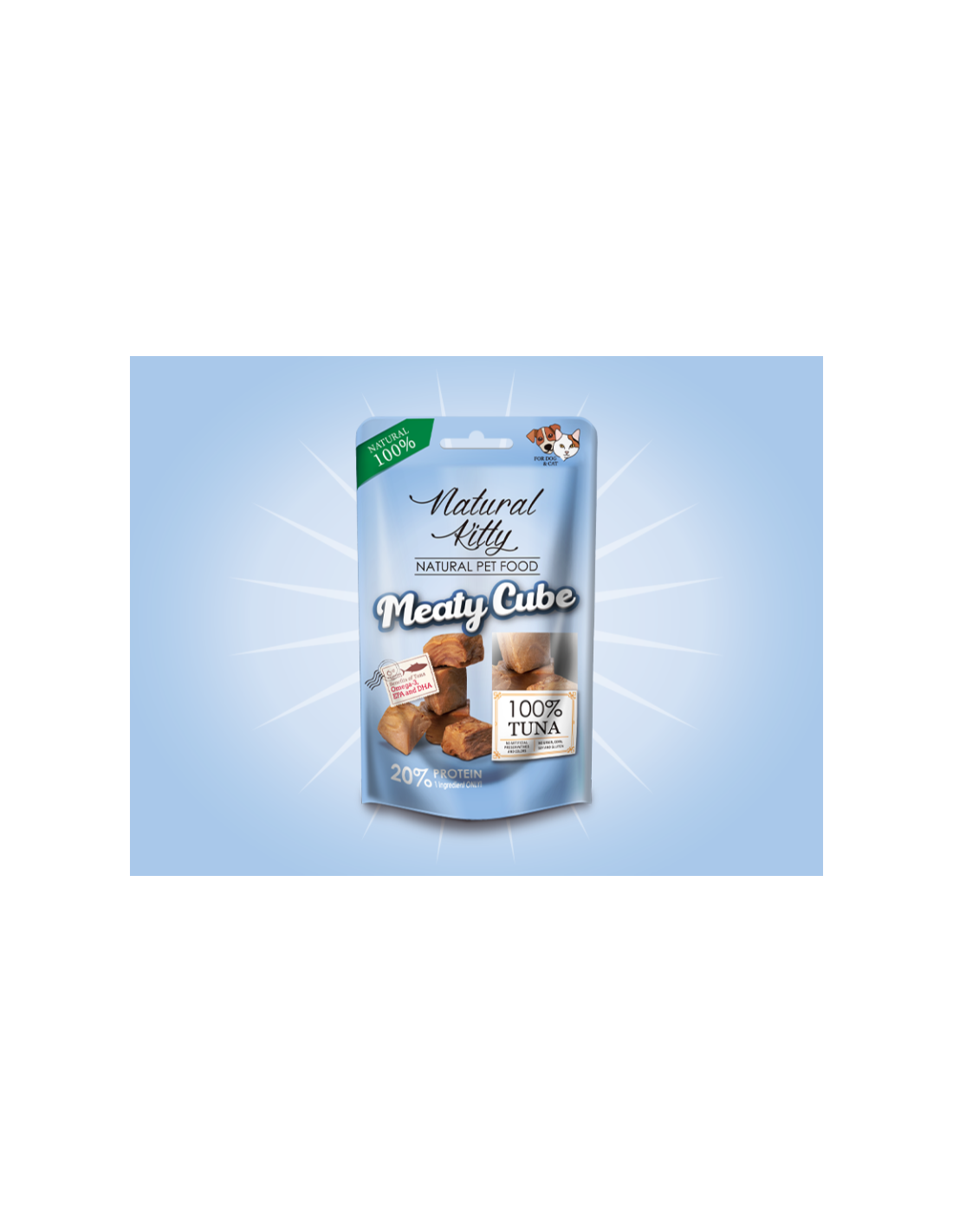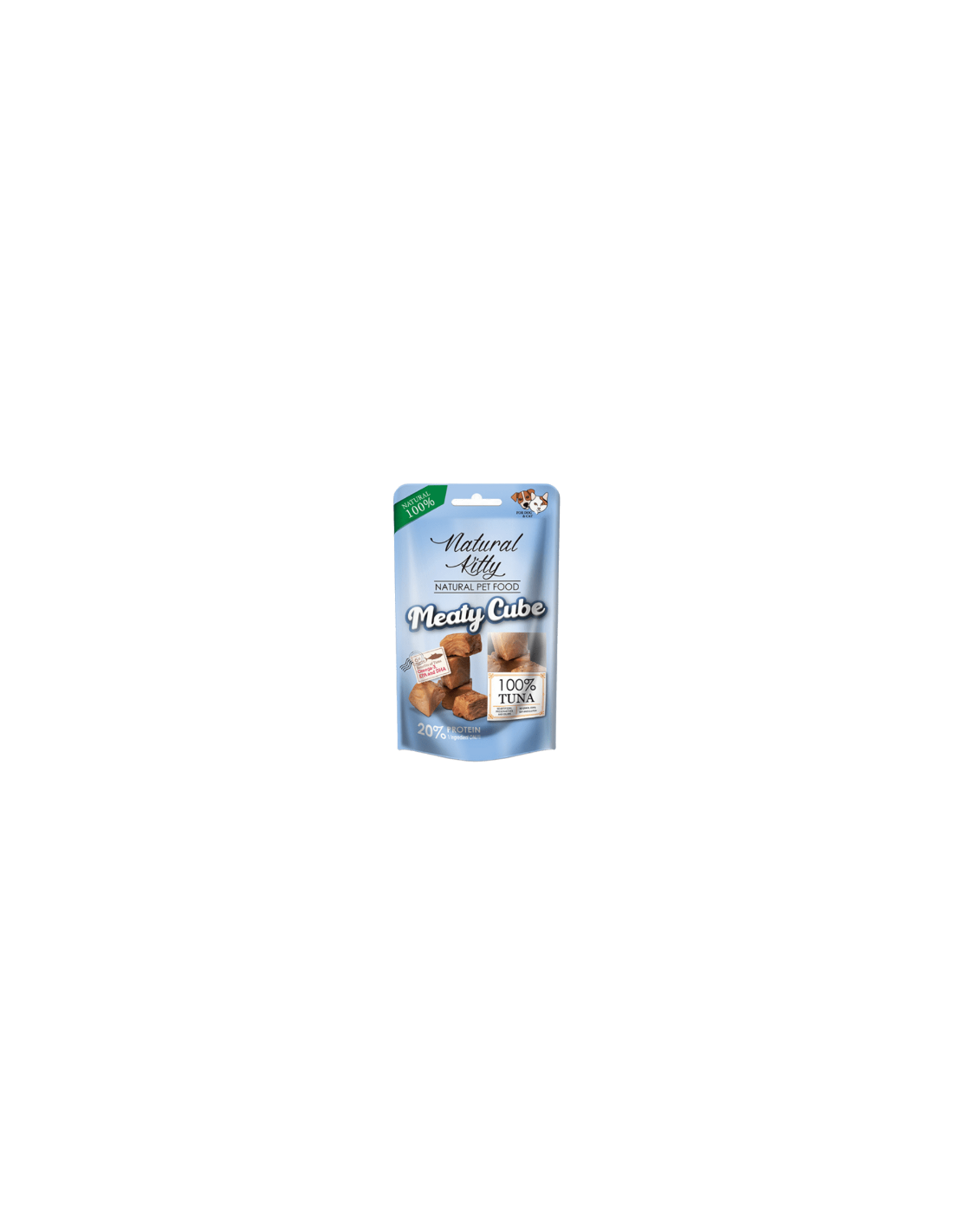 Natural KittyNatural Kitty Przysmak Meaty Cube Tuna to naturalny przysmak dla kotów i psów z tuńczyka. Jest to produkt bogaty w białko, z minimalną zawartością tłuszczu. Nie zawiera ani sztucznych dodatków ani glutenu. Przysmak świetnie sprawdza się jako nagroda lub urozmaicenie diety.