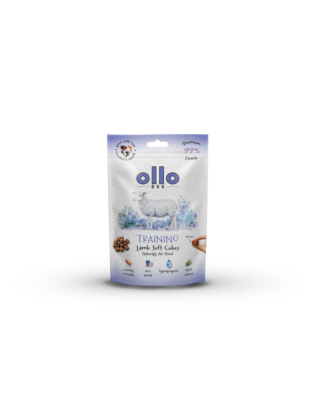 Przysmaki dla psa Ollo Air-Dried Training Lamb Soft Cubes to naturalne, hipoalergiczne, monobiałkowe smaczki z jagnięciny. Są delikatnie suszone powietrzem. W kształcie kostek o wymiarach ok 10 mm. W 100% naturalny produkt, stworzony z myślą o psach wszystkich ras i w każdym wieku. Są miękkie i monobiałkowe, co jest niezwykle istotne dla psów z alergiami pokarmowymi oraz tych z wrażliwym żołądkiem.