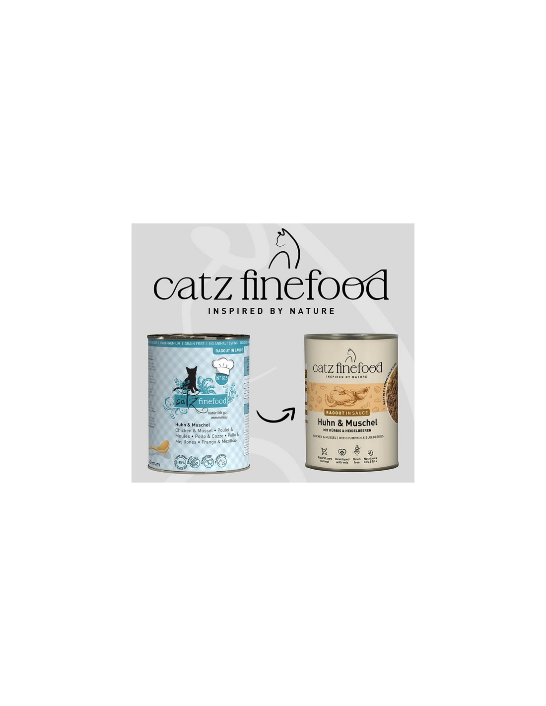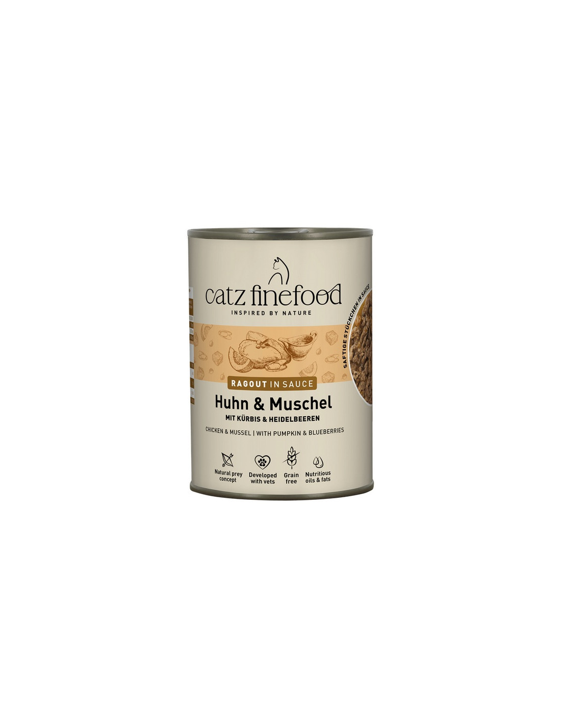 Kurczak 58% (mięso z mięśni, serce, szyja, żołądek i wątroba), bulion z kurczaka i małży 27,2%, małże 10%, dynia 3%, borówki 1%, minerały 0,5%, olej z wiesiołka tłoczony na zimno 0,2%, chlorella 0,1%.