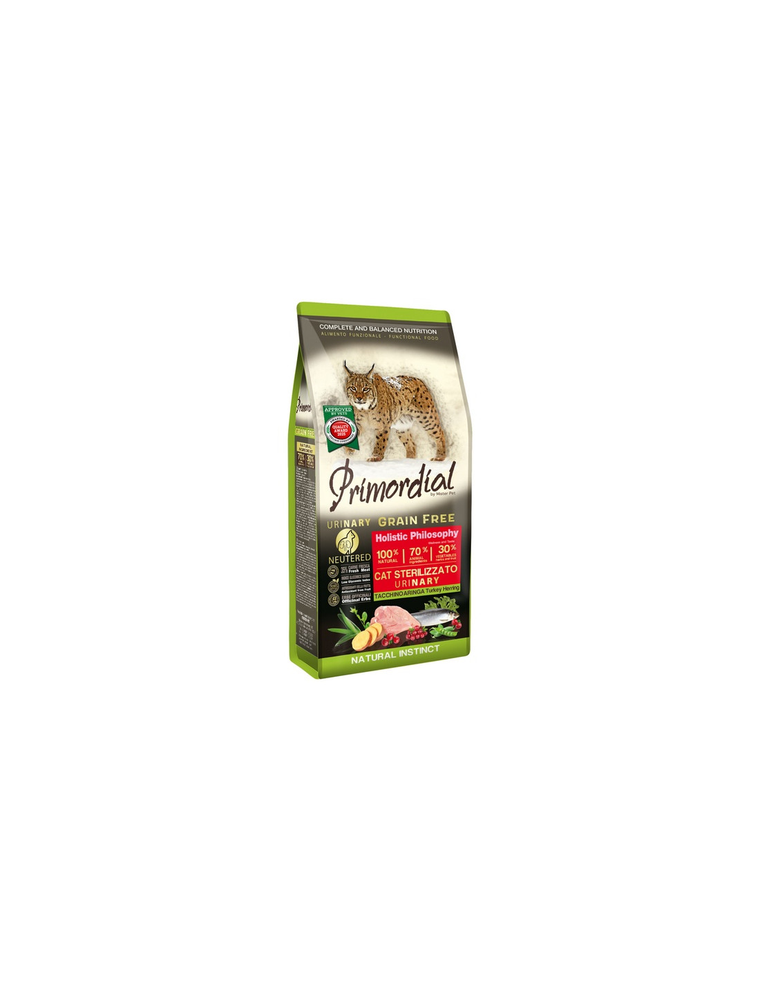 Primordial Grain Free to karma stworzona w oparciu o holistyczną filozofię żywienia, idealna do zbilansowanego żywienia kotów. Zawiera 30% warzyw, bogatych w składniki aktywne i olejki eteryczne: wyselekcjonowane warzywa, owoce (w tym żurawinę, bogatą w witaminy i naturalne przeciwutleniacze), zioła lecznicze (w tym rozmaryn), lespedeza capitata wspomagająca układ moczowy, prebiotyki MOS dla równowagi flory jelitowej, wodorosty.