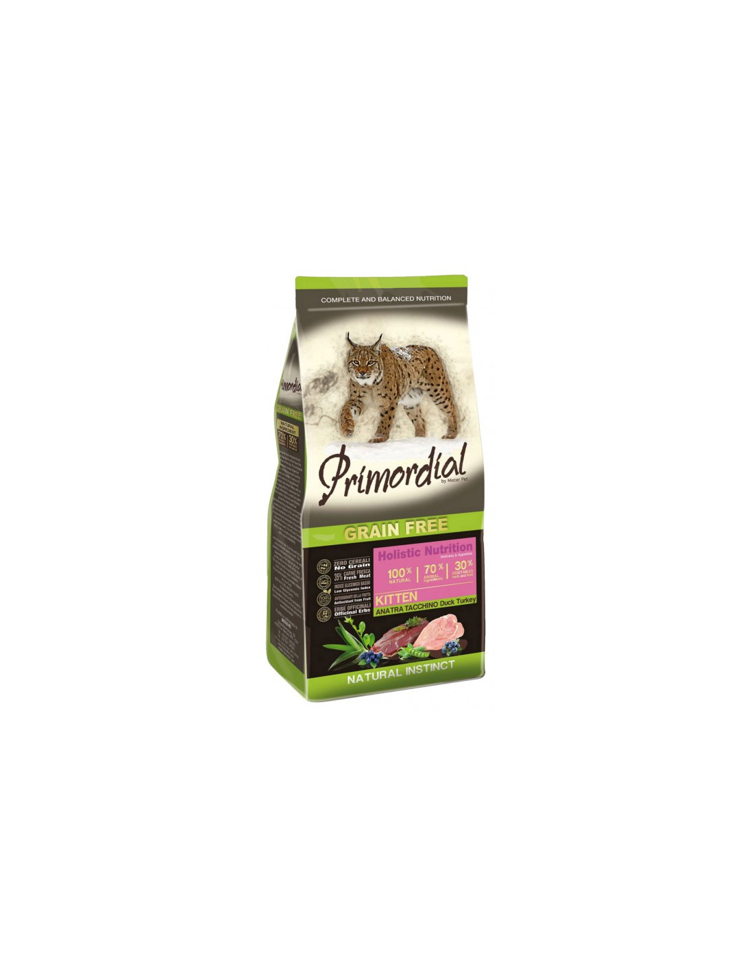Primordial Grain Free to karma stworzona w oparciu o holistyczną filozofię żywienia, idealna do zbilansowanego żywienia kotów. Zawiera 30% warzyw, bogatych w składniki aktywne i olejki eteryczne: wyselekcjonowane warzywa, owoce (w tym borówki, bogate w witaminy i naturalne przeciwutleniacze), zioła lecznicze (w tym rozmaryn), lespedeza capitata wspomagająca układ moczowy, prebiotyki MOS dla równowagi flory jelitowej, wodorosty.