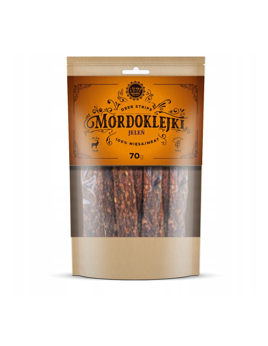 TRZYPSY DELUXE Mordoklejki to w pełni naturalne gryzaki dla psów, wykonane ze 100% mięsa w formie podłużnych pasków. Nie zawierają konserwantów ani barwników. Przysmak ten jest smaczny i pożywny, stanowi doskonałe uzupełnienie codziennej diety naszego pupila. Idealnie sprawdzą się jako nagroda.